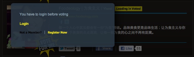 2. 下拉页面第四个就是为食主义啦!点VOTE NOW! 就会弹出一个窗口让你登陆(Login)或注册(Register Now)。去年帮过为食主义投票的朋友可以用旧帐号(如果你还记得的话),不然就点注册。