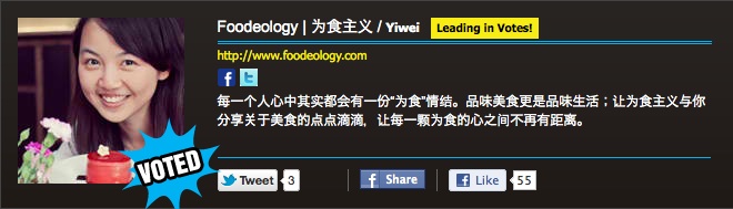 所以,又到了要投票的时候了。如果你曾经被为食主义的图片所吸引;如果你曾经与为食主义的文字有过共鸣;如果你也与我一样有一件自己喜欢的事并想把它做好,那就帮我投票吧!