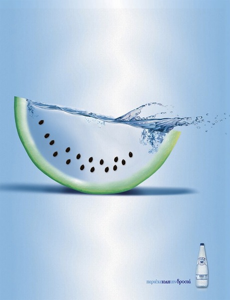 矿泉水真的很好啊,水与西瓜的完美的结合,让人有一种夏日里吃到冰西瓜那种痛快淋漓感,加上西瓜的结合,让人不仅会觉得这水里有什么维生素啊,什么的,是安全的,自然的。对身体百益而害。很好的一条创意广告!