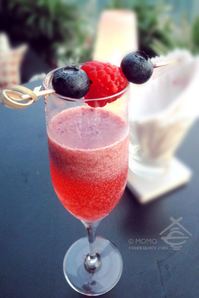 首先来暖场的,便是KU DÉ TA的两款招牌鸡尾酒。这杯红艳动人的,是由Prosecco气泡酒、Chambord甜酒和新鲜浆果们调制而成的浆果贝里尼(Berry Bellini),莓果的清甜和酒味的淳香混合得恰到好处。这款甜美清爽的饮料,当天格外受女性来宾们的欢迎,我也一连要了好几杯~