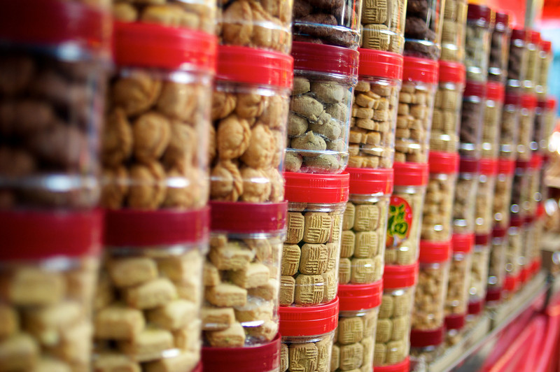 红盖是因为喜庆,透明罐或许是为了让你看得到里面玲珑的点心。于是一到过年,这类的罐子就成了超市里的风景。凤梨酥、蛋卷、杏仁酥、花生等等,每家每户一定都有几个红盖透明罐,一不看好那些小孩子,可能他们就把这些拿来当饭吃了。