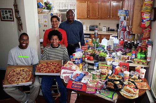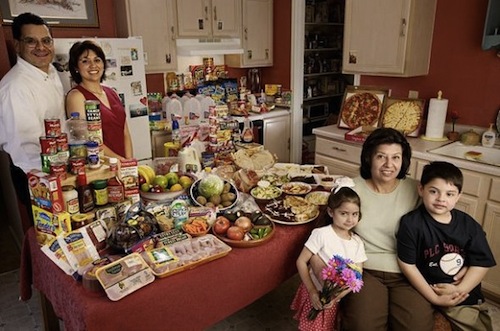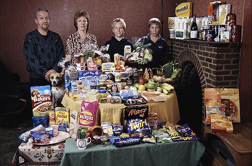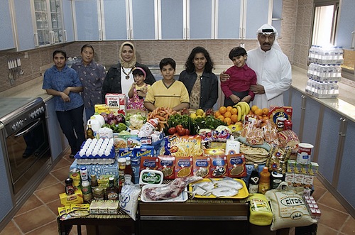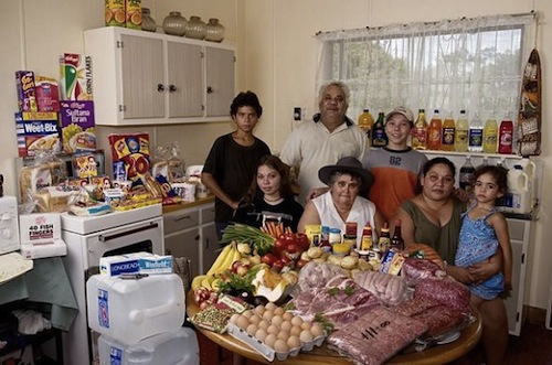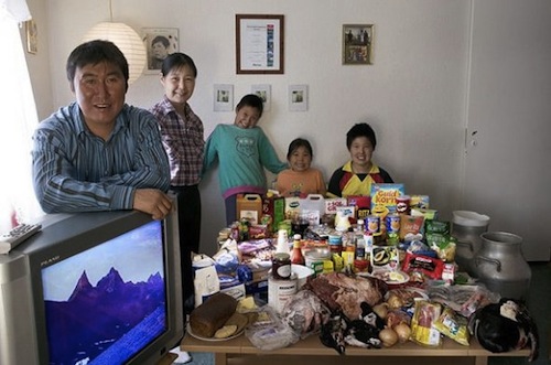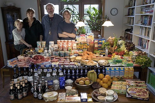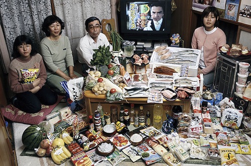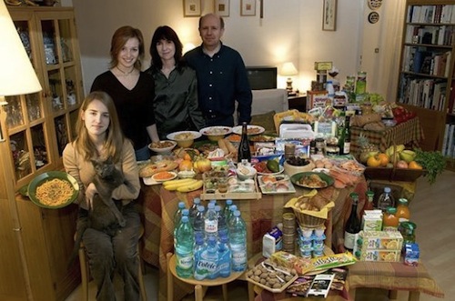 这组图片出自摄影师Peter Menzel 和记者Faith D’Aluisio 这对夫妻档在2005年编著出版的一本调查报告《饥饿的星球》(Hungry Planet)。他们一同造访了24个国家的30个不同家庭,对他们每周的食物进行了详细的调查和统计(合计600顿饭)。全书以旅行散文的形式向我们娓娓道出各个国家不同的风土人情,它让你以最快的速度了解全世界人民饮食文化。