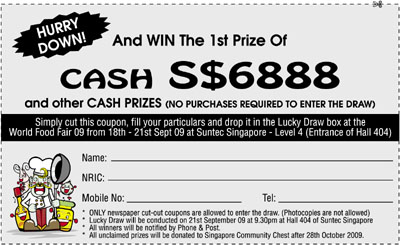 请关注《联合早报》、《联合晚报》、《新明日报》、《海峡时报》和《Today》,剪下报纸上的表格(见下),参加幸运抽奖,就有机会获得6888元的奖金!(只有报纸上剪下来的才有效哦!)