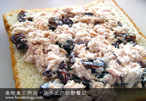 罐装金枪鱼有很多种,也有已经调入蛋黄酱的,但那些不是很好吃,还是吃为食厨房出品的吧。葡萄干有画龙点睛的作用,夹在三明治里面的甜味既中和了鱼腥,又丰富了口感。
