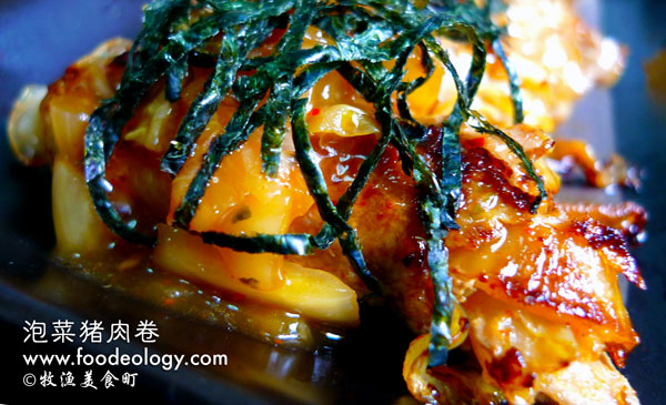 - 另起油锅,将卷五花肉剩下的材料(就是步骤2的材料)剁碎,混合泡菜汁2勺、酱油1勺、水2勺加热,然后加水淀粉勾芡变成酱汁。