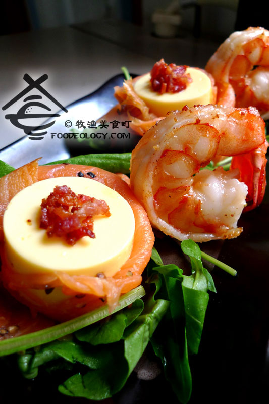大虾4只、烟熏三文鱼4大片、培根2片、蛋豆腐2管、芝麻菜(Rocket Leaf)适量。