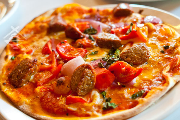 一个香肠披萨,但它里面还有红椒、焦糖红洋葱(Caramelized red onions)、迷迭香与牛至(Oregano),所以香味特别独特。