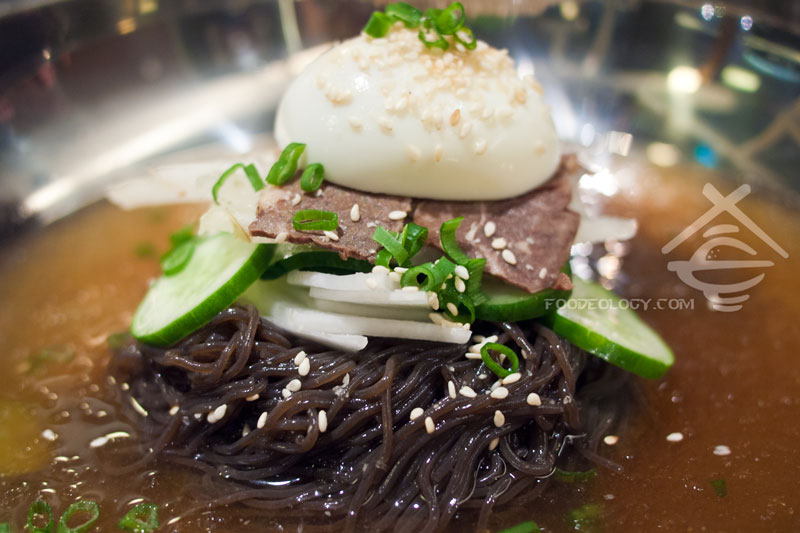 一不小心好像吃了一串的牛肉味,连这特别的冷面也是用牛肉汤做出来的。用荞麦做的面条比一般的荞麦面口感Q滑很多,更具弹性,有点红薯粉丝的感觉。它吸收了冰镇的牛肉汤的鲜美,纵然是一道主食类小品,却极为开胃,在星星国的大热天吃就更合适了。