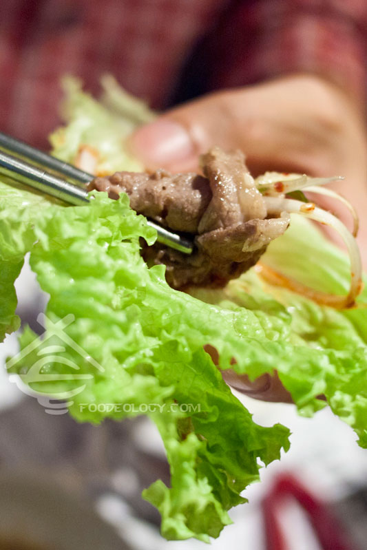 而如果你要做一个到位的吃货,就用比较专业的吃法,在肉上放点洋葱,圈起来蘸一蘸密制酱,放在蔬菜上裹起来吃。只是这肉实在是美味,没有蔬菜也不觉得腻。