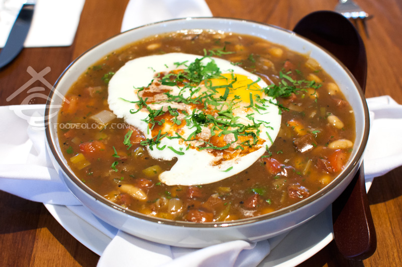 用chipotle辣酱、西红柿、芳草、眉豆(white bean)、韭葱(leek)等“乱”炖而成,散发着浓郁的类似肉汁的香味,颇有一番居家的感觉。上面的那只美丽的煎蛋明晃晃得让人不忍破坏,但你若是把它舀起来吃,便是外行了。应该把它搅进汤,变成一碗老少皆宜的美味汤羹。一个人点一份可能有点单调,建议2-3人分享。