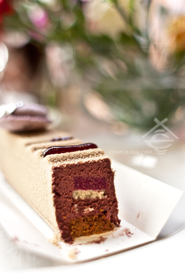 但与之前这个慕丝相同的,是它里面层层的精致。黑加仑的果酱,巧克力慕丝的质地,底层在照片上不太看得出的脆爽巧克力泡层,为食主义都说这样的老板有点完美主义了么,不然怎么会对每一个细节那么讲究。