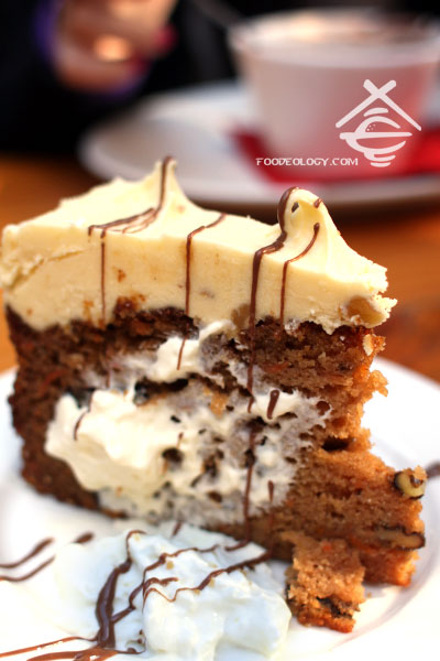 蛋糕上层是厚厚的奶油乳酪,蛋糕松软可口,还夹杂着许多大核桃仁。蛋糕本身味道不会很浓,但配上那层厚厚的奶油乳酪,真是恰到好处。