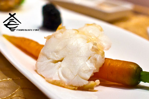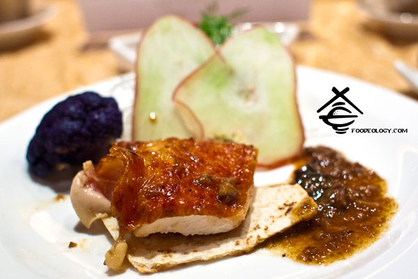 如果说炸鸡还是一道很常见的菜,那么用切片的法国黑松露加菌菇与轻榨优质橄榄油(virgin olive oil)调制出来的酱就是一份很特别的佐料。香醇浓郁的酱汁及边上薄薄的切片莲雾和紫色的花椰菜,让这道菜变得与众不同。