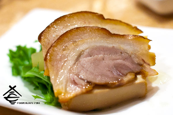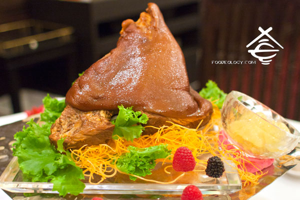 卤香猪手用传统的潮式卤汁腌制,这种加有肉桂、八角、茴香及上等玫瑰露酒的卤汁让这道冷菜虽然切片很薄但依然芳香四溢。而且用冷菜的处理方法使猪手里的筋更有嚼劲,吃了还想吃。