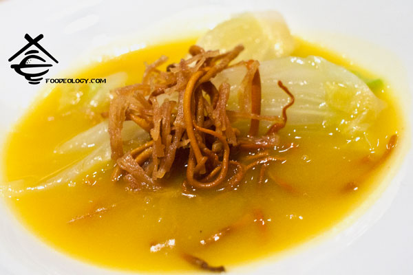 南瓜是在中华料理中一种常见的菜,但很奇怪的是南瓜汤却在西餐中比较常见。白菜与冬虫夏草先蒸煮15分钟,再加入南瓜汤炖煮,让南瓜天然的甜味浸润其中,营养美味。