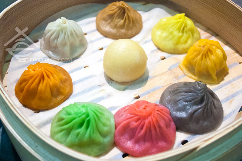 而且,它家的这个招牌产品较乐天还是要聪明些。虽然橙/黄色系的小笼包偏多,让人分辨得眼花,但不讨喜的灰黑就少了,而且黑也黑得谦卑一点,整体感觉更加温暖和谐。红色开始逆时针方向:辣牛肉、素菜、辣鸡肉、黑松露、鲜虾、芝士、鹅肝、原味,外加中间一个鹤立鸡群的奶黄包(不要问我为什么会有它)。如果你的第一反应是“色素”,那么大可放心,翡翠江南用的全是天然着色:红色是辣椒油,绿色是蔬菜汁,橙色是胡萝卜汁,黄色是黄油,褐色是酱油,黑色是墨鱼汁。