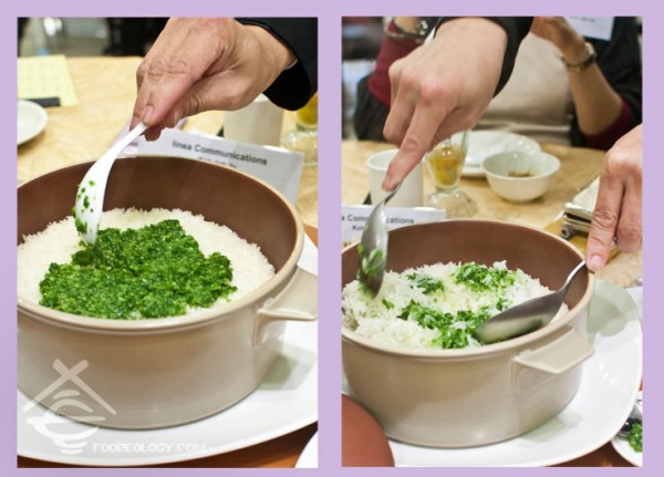 出锅后用浓郁的葱油涂在米饭上,再加盖焖制5分钟,这样出来的饭,不仅颜色苍翠欲滴,也更好地吸收了葱油香,空口都能吃上一碗。