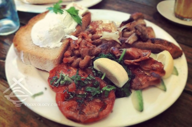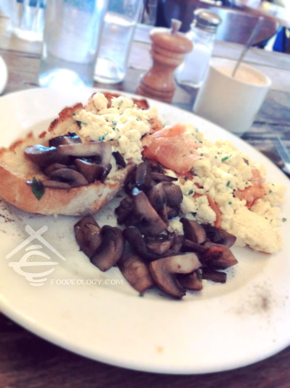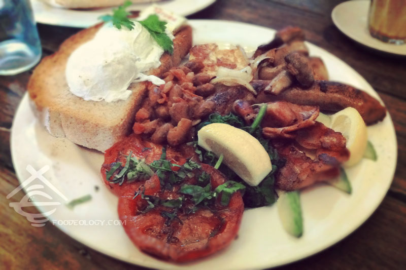 香肠是牛肉香肠,牛肉味很浓郁,颇有澳洲香肠的特色。蘑菇与西红柿一样多汁美味,倒是它的poached egg没有breakfast stack上那个做得好,水平有点波动。值得一提的是它的面包是酸面包(sourdough),据说有人叫它作“搔耳朵面包”。这种面包在澳洲很常见,在新加坡为食主义好像还没有遇上过。