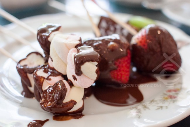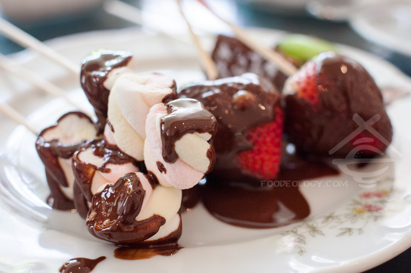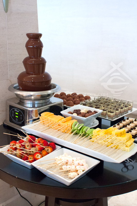巧克力喷泉是很多自助餐的一个亮点。虽然这个喷泉比我想象中的小很多,但鉴于巧克力浆的质量高,也就不计较了。喷泉边上还有一个巧克力甜品大会,其中包括巧克力慕丝、布朗尼Dulcey chocolate brownie)、巧克力松露(chocolate truffles)等等,特别适合巧克力爱好者们。
