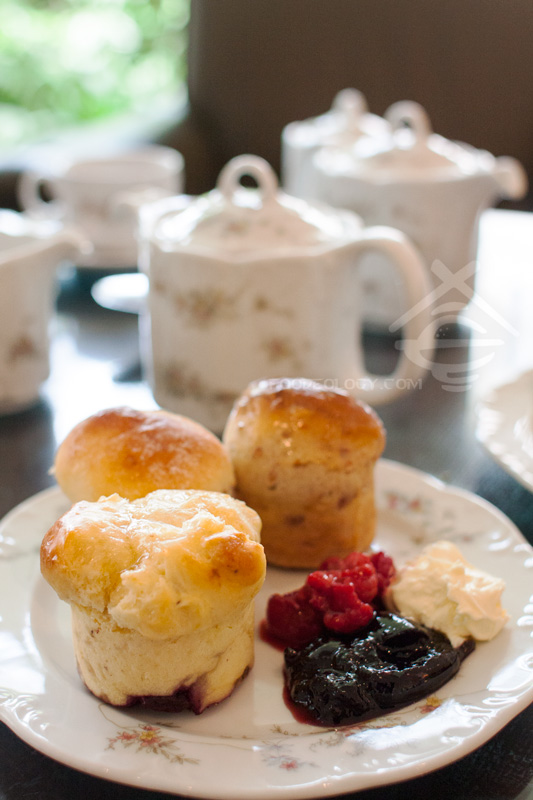 来到英式下午茶,不可不试英国松饼(司康饼;scone)。而且Devonshire Scones是良木园的招牌,分别有原味、蔓越莓(raspberry)和蓝莓三种口味。上一次吃这样的松饼还是在墨尔本的时候,想来那已经是3年前的事了。不曾尝试过真正在英国的司康饼,但它的质地与味道很接近墨尔本最出名的司康饼,应该算是不错吧。