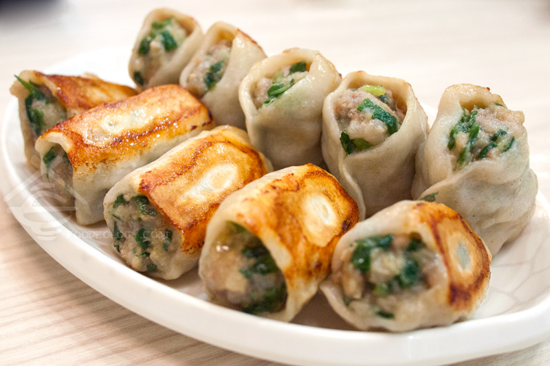 锅贴的三鲜馅里有猪肉、虾肉和蟹肉。这里的锅贴的奇特之处是它不是普通的饺子形状,两边开了口,倒像是肉卷。这么包的好处就是肉比较多,个顶个的结实。