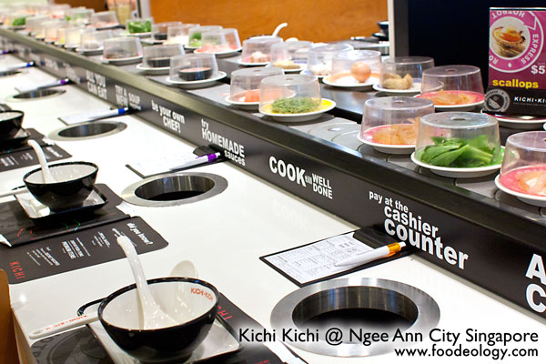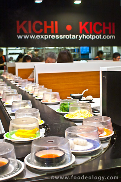 Kichi Kichi采用的是火锅自助,一定的价格任你吃。大多食材都在传送带上,厨房里添菜添得很快,传送带上一直都是满满的。每盘里的分量不多,但对于一些你只想先尝一尝的食物来说,小分量才是合理呢。
