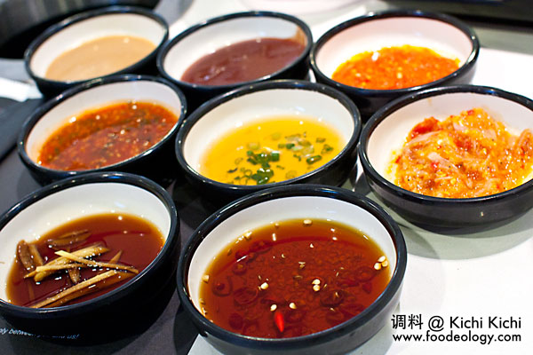 说完汤底与食材,来说说它的佐料。与为食主义去过的所有火锅店都不同,Kichi Kichi连佐料都不用你站起来去拿。。啊哈哈,真是太方便了。一共8种佐料,有一些是很普通的酱料,有一些则是Kichi Kichi特制的。据说最受欢迎的是Kichi Kichi辣椒酱(左中)和芝麻酱,不过因为对芝麻酱不太感冒,为食主义更喜欢它的辣椒酱和另一个马来风味的cinchalok辣椒酱(右下)。