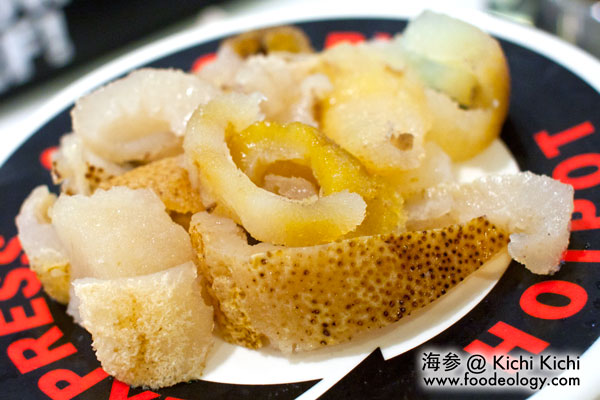 鲍鱼味道鲜美,刺身也新鲜,还有放汤的海参,这些在火锅店里出现,还是很让人意外的。(哦对了,这个放海参的盘,就是上面说的黑红相间的厨师特选菜的餐盘。)