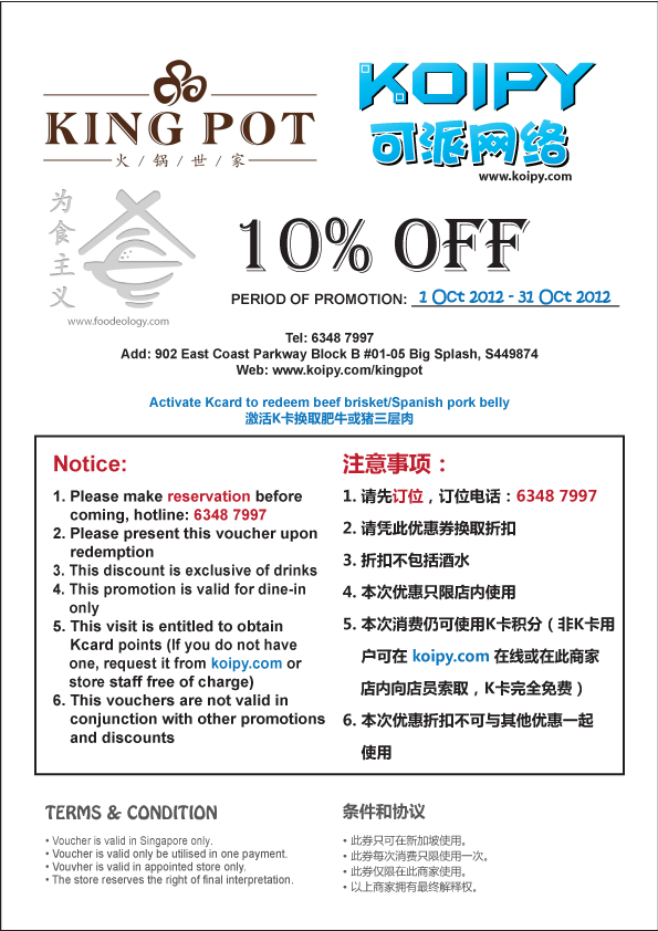 这个10月,为食主义与可派K卡再次联手,推出“为食优惠”第二期,在King Pot套餐、单点一率9折,激活K卡还可换取免费肥牛或猪三层肉一份。