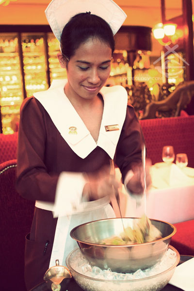 你大可不必质疑这是不是只是一个噱头,是不是其实只是在厨房里随便拌几下。因为既然叫了这个名,人家就是把一小餐车推到你面前,在你面前加料加汁,当场把沙拉盆放在冰上呼啦啦地转。