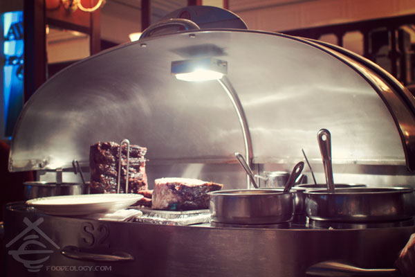如果说刚刚那沙拉小车就让你觉得服务到家,那这个牛排“大”车真是让人觉得把厨房都搬出来了。在厨房里用慢烤(slow roast)的方法烹制,来到桌前当场切当场淋汁,所以出来的牛排不温不火但保证新鲜。