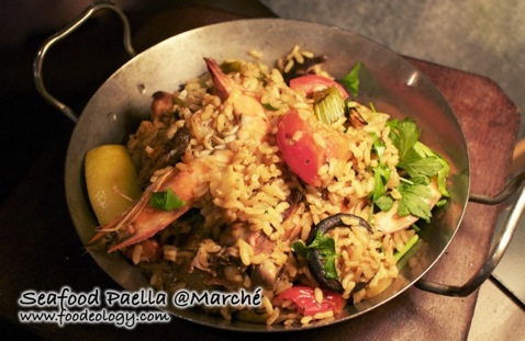 Seafood Paella就是在一个巨大但不深的平底锅里的拌饭。放在那里的时候,是一堆虾匍匐在一盘饭上。盛到小盘里才发现原来下面蕴藏着鸡肉、香菇、西芹、西红柿等等。一个portion三只大虾3块鸡肉,够两个人分了。站在Marché的价位上看,S$13.9还是很值得的。