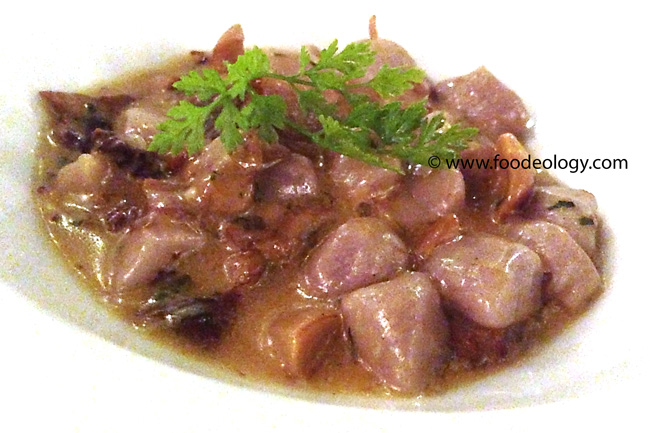 三色土豆团子(Tricolore Potato Gnocchi)加古冈佐拉蓝纹芝士(Gorgonzola Dolce D.O.P. Cheese)。Dolce是古冈佐拉芝士里甜的那种(另一种叫Gorgonzola Piccante),名字里的DOP说明这个芝士只有在意大利的某些地区可以被生产。这种蓝纹芝士传说味道辛辣,带有蘑菇的味道,不过好像没怎么吃出来。($30)