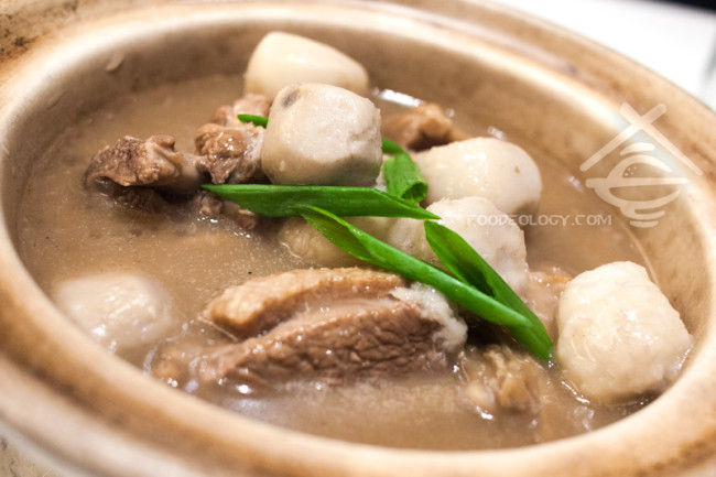 莆田的老鸭下的不是鸭蛋,是芋蛋(好冷 =.=||)。用老鸭汤煲出来的汤,融合了莆田小芋球的芋粉,让汤更为鲜美浓稠;而上面点缀的一颗颗芋球雪白光滑,比一般粉粉的芋艿好吃很多。据说当芋球煮好后,如果它还是白色的,那就是新鲜“年轻”的芋球,如果变成褐色还带着很多纤维,那就是老芋球了。