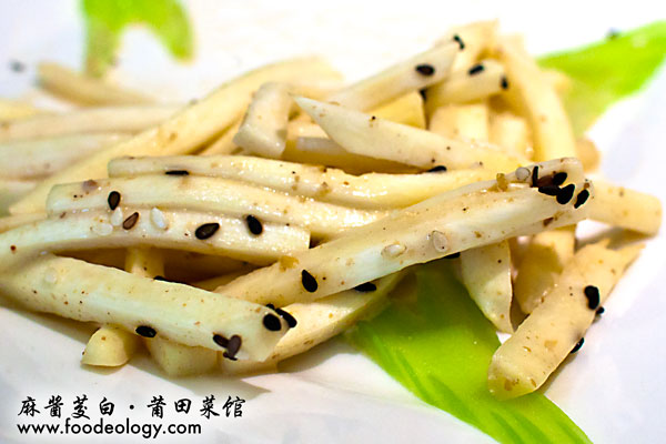 莆田菜馆的这道麻酱茭白冷盘,在茭白上淋上特制的芝麻酱,吃起来有浓浓的芝麻香,非常特别。不过因为芝麻酱口感比较厚,它多少覆盖了一点茭白本身清淡的风味,热衷于茭白本身脆爽口感的朋友可能会觉得它略偏厚重。