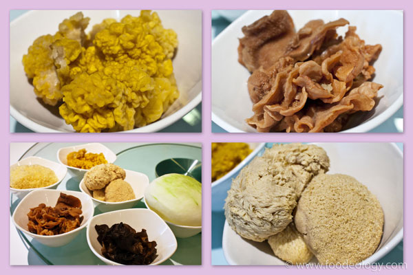 这些菌菇是特别从菌菇之乡中国云南运过来的。黄耳(下图左上)因产量不高,属于比较珍贵的真菌品种,性味甘、温微寒,有清心补脑的保健作用;鸡冠菇(下图右上)别名白参,有消炎、利尿、去湿作用,所以特别适合在潮热的夏天食用;而猴头菇(下图右下)更是山珍之首,与熊掌、海参、鱼翅一起被列为四大名菜。