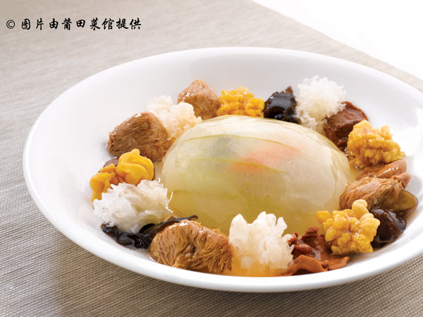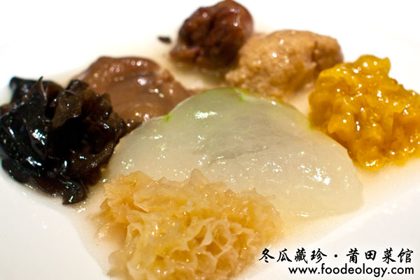 “冬瓜藏珍”这个名,可不是随意起的。这道菜里除了冬瓜还有黑木耳、银耳、黄耳、猴头菇与鸡冠菇,真的是一串山珍呢。