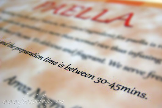 点了单之后各种菜陆陆续续上来,可是当所有开胃菜都吃完了,还是没有Paella的身影。你说它上菜慢,可这也忒慢了吧。再等了10多分钟,还是没有上菜的意思,让人彻底失去耐心,想掀桌子。打开菜单想瞅瞅它究竟有什么了不起为什么这么姗姗来迟,于是看到了让人特别囧的一行字: