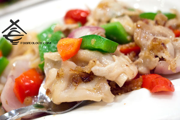 象拔蚌是海鲜界的一道珍馐,取的是象拔蚌巨大虹吸管上的肉。虽然它的长相这么有特色,上了餐桌却完全看不出来。青椒、红椒加洋葱,那个喧宾夺主呀,找象拔蚌好似在挖宝。