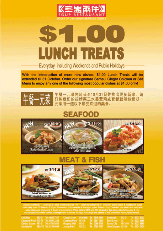 - Seah Street和Scottswalk分店每日11.30am-2.15pm有效。