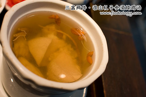 最后上个滋补汤──这款儿我写的时候差点忘了,因为点的时候也差点忘了。我几乎都不记得这是一间自称soup restaurant的地方,我居然点了半天没有点汤。所以叫了一个看起来大补的鸡汤,有枸杞、有人参、有鸡肉。不过5块左右的汤,也没指望它是多大一碗,果然是一小盅呵。