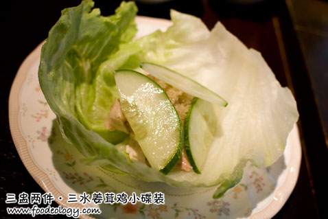 耶?原来是北京烤鸭的吃法哦!拿一片生菜,放上块鸡肉,贴几片黄瓜,再点上一小撮姜茸,原来这三水鸡吃得这么讲究的。