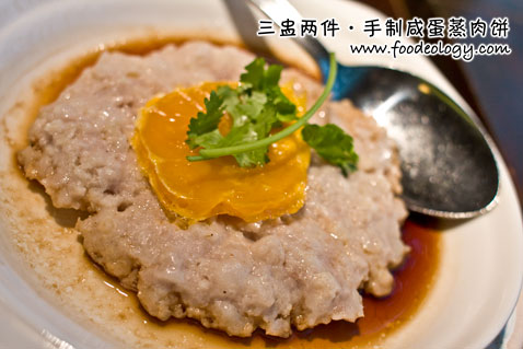 和那庞大的三水鸡比,这肉饼就小家碧玉好多──而且太小家碧玉了点,让我觉得近S$15元的价格与量有点不符。这一盘我是不怎么看好啦,虽然味道并不差,但第一它的蛋不是咸蛋味──虽然我也没爱吃咸蛋,但你既然叫咸蛋了就得像咸蛋嘛;第二我觉得猪肉剁得不够碎,功夫不是很到家。