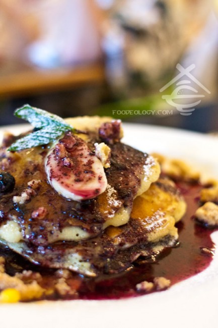 看上去卖相并不是最好,但这个大众推荐的煎饼,确实有它闻名遐迩的理由。很松软的煎饼,在粘牙与颗粒口感两个极端之间找到最好的平衡。看上去非常浓郁的蓝莓酱甜度正好,化在口中淡淡的蓝莓香。还有盘中的两种水果,蓝莓新鲜多汁,香蕉增添了风味,总之合在一起就是完美的组合!3块煎饼的量也很合理,吃完了还有胃口吃甜品呢(Spruce的蛋糕看上去又大又诱人,可惜那天主食吃多了,没有尝到蛋糕)。