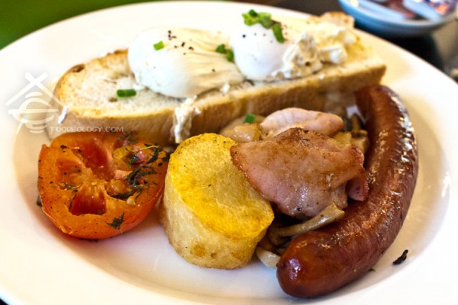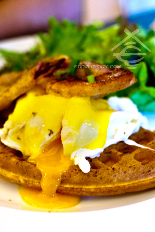 waffle做得很到位,软硬刚好,太脆的不适合和鸡蛋一起吃。水煮蛋的功夫是eggs benny的重点,看它一地流质的样子,是不是已经让你馋涎欲滴了呢!不过这一份分量不大(因为价格也是其它的一半),建议大家点的时候另加一些边菜,比如香肠、土司、煎饼之类。