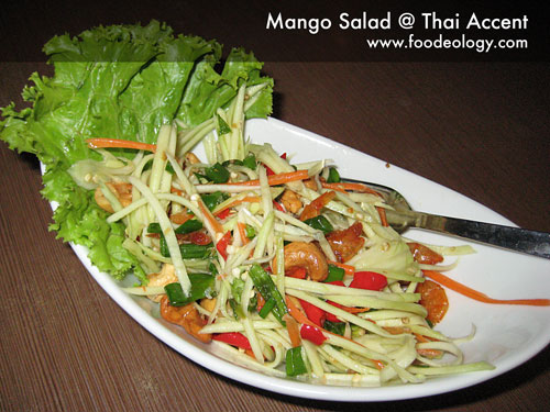 而Thai Accent的正是投我所好,不但没有洋葱还有香香的腰果,味道也比Thai Express的要酸,大爱大爱!但有一点,Thai Accent的芒果沙拉里有好多青红小辣椒。小辣椒是辣椒堆里最无敌辣的,又被切得很小,一不小心就吃进去一些。虽然菜单上把这个菜标了一个辣椒而已,可你若是吃到那些小辣椒,真是标3个辣椒都不够哇!
