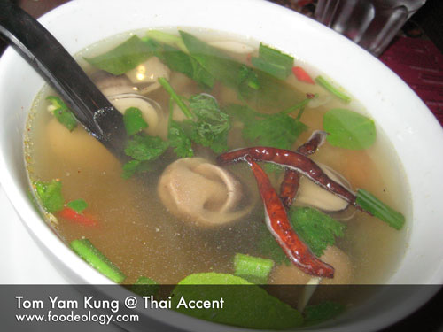 冬炎汤有两种。一种是像咖喱一样的厚汤底,看上去就觉得辣;另一种是清清的看上去以为是清汤其实味道一样够酸够辣。Thai Express的冬炎汤是清一色的清汤,而Thai Accent的是可以选择其中一种,为食主义选的是清汤。