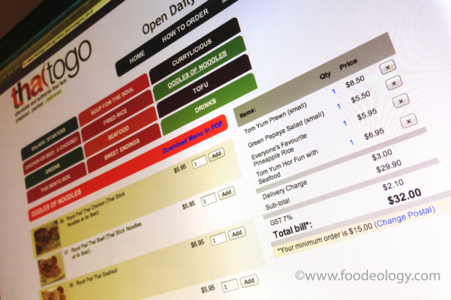 不过宅在家里的后果就是如果冰箱正好被清空了,就会有一点弹尽粮绝的空虚感。叫外卖吧,那些肯德基、麦当劳、必胜客、Canadian Pizza、Oishi Pizza、Pasta Mania等等之类西餐快餐实在让人挺不起劲,FoodPanda上的那些外卖又生僻得不知道好不好吃,还有Sakae Sushi这种高一档次的外卖仅外卖费就7块,好像又不太划算。看到几个美食部落客介绍过一个泰国料理外卖Thai To Go,貌似还有点靠谱,就决定来试一试(至今我还是先看是谁的部落客才相信TA的推荐,不知道为食主义有没有这个指导作用哈)。在墨尔本的时候和朋友一起叫过一次泰国料理外卖,感觉墨尔本这样的非快餐外卖比新加坡多,莫不是因为澳洲人比较懒?;)