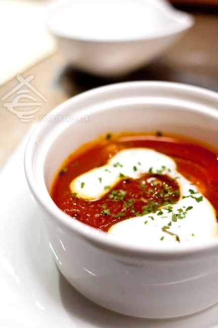 看上去很普通的番茄汤,其实味道非常特别。很浓的烟熏味,很纯正的番茄香,时令海鲜进一步提升了它的鲜味,简单而精致。