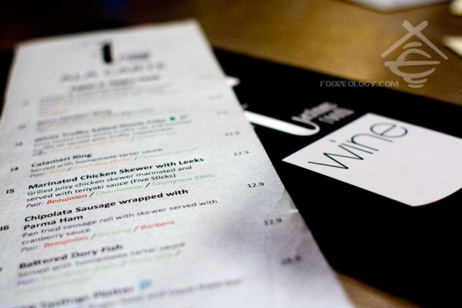 说是餐配酒,咱也得懂什么餐配什么酒呀。懵懵懂懂的朋友们不用担心,菜色上五颜六色的字,就是你最好的解说员。红色为红酒,绿色为白酒,黄色为香槟,不需要在50多种酒中雾里看花,只要记得“先白再红,香槟配甜品”,这些餐配酒的基本格式就好啦。